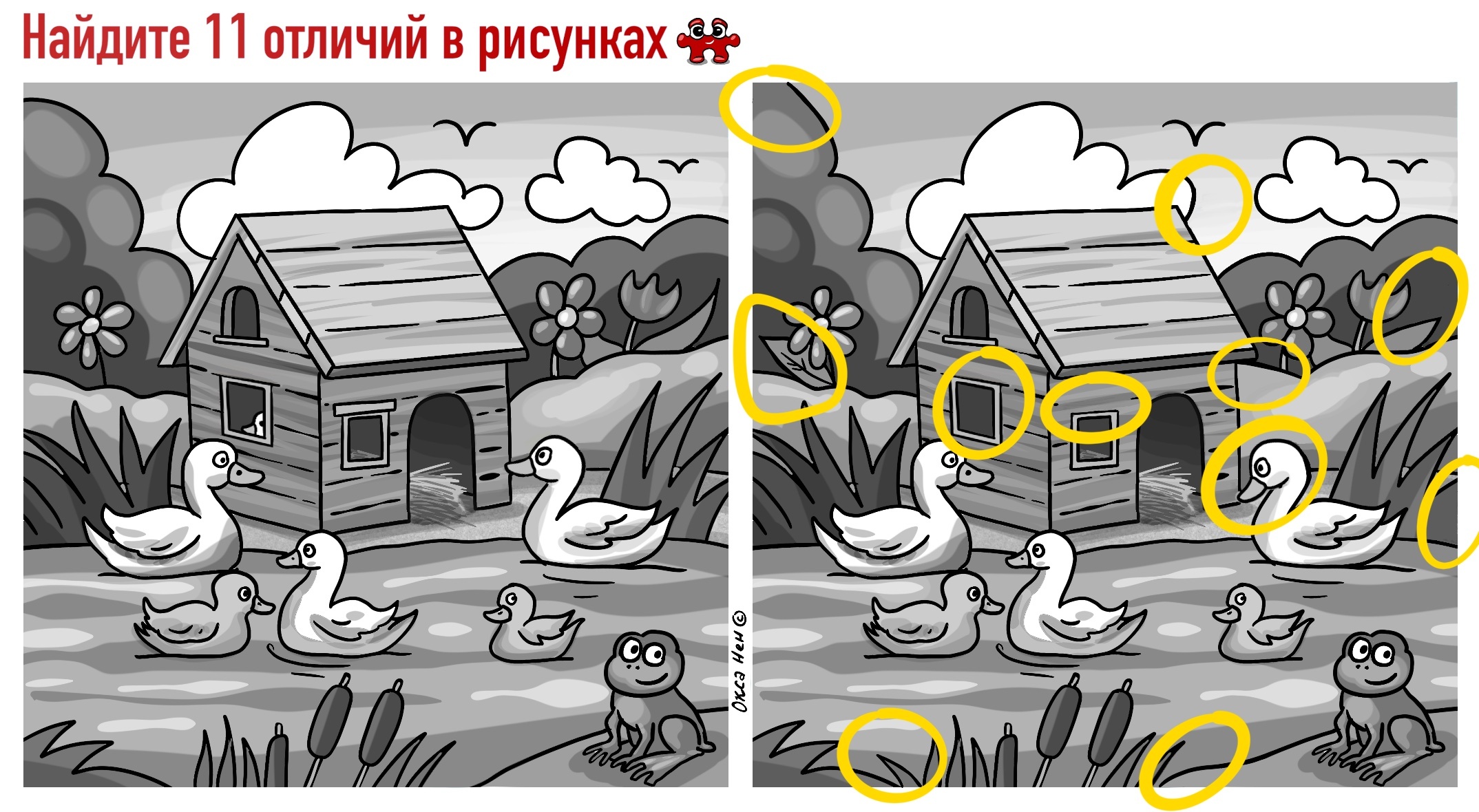 Художник, нарисовавший картинки, на которых надо найти 11 отличий, видимо, тоже помнит лето и любит уточек. Они плавают в водоёме рядом с домиком — видимо, это их жилище.
