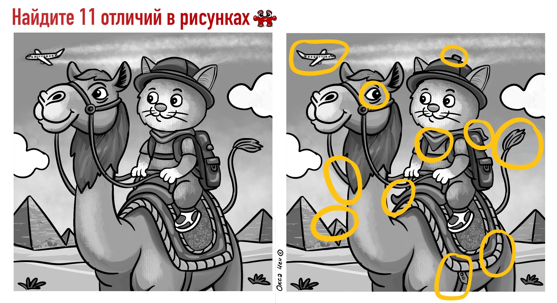 Все люди любят отдыхать и путешествовать. У меня, когда я каталась на верблюде по Сахаре, было такое же довольное лицо, как у котика на рисунках, на которых надо найти 11 отличий.
