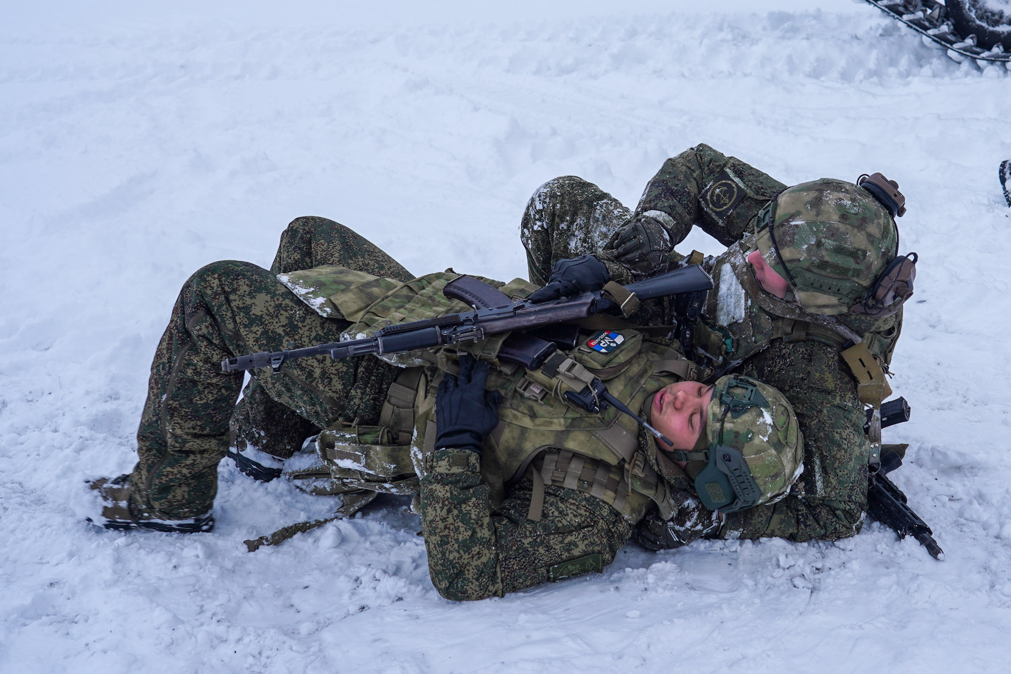 Такой способ отрабатывают на одном из полигонов в Мурманской области бойцы мотострелковой бригады Северного флота. Среди инструкторов и военный медик с позывным «Ярый».