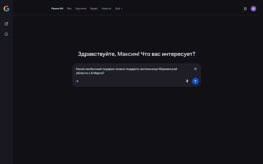 Нейросеть от зарубежного поискового гиганта на запрос — какой необычный подарок можно подарить жительнице Мурманской области к 8 Марта, — советует сделать акцент на северной идентичности и утеплиться, раз мы живем в высоких широтах. Пока что все логично.