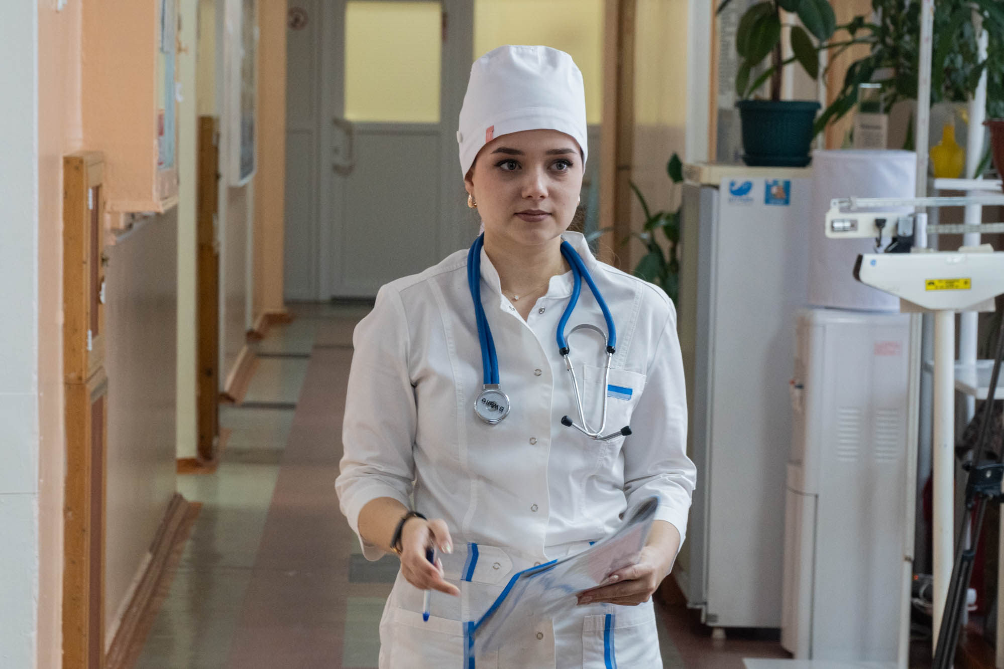 Миниатюрная девушка трудится старшим врачом терапевтического отделения в Североморском госпитале Министерства обороны. Это легко понять по полосатым «пижамам» здешних пациентов — такие вы наверняка видели в новостях, когда поздравляют или вручают награды раненым, вернувшимся с фронта.