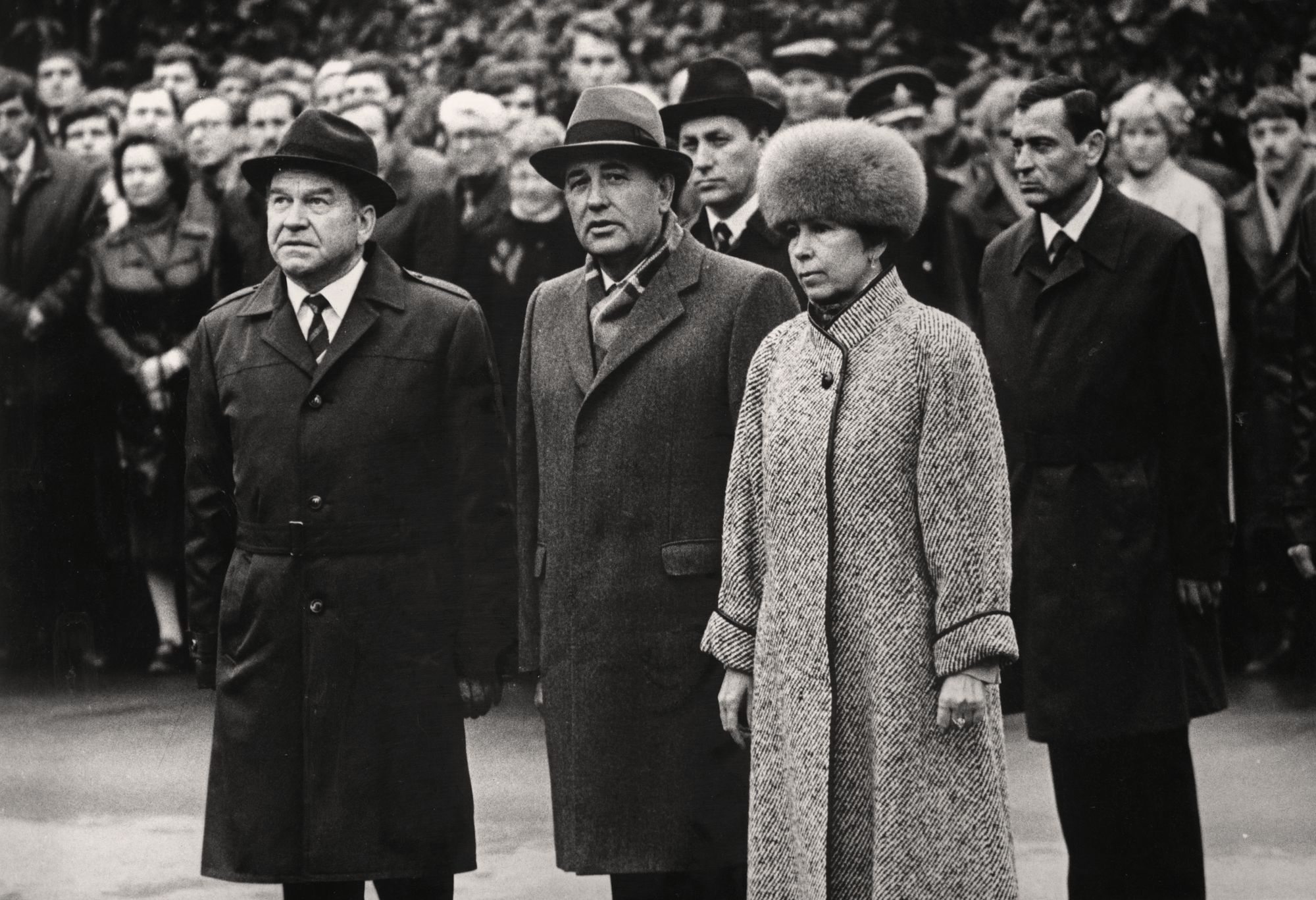 В. Н. Птицын (1-й слева), М. С. Горбачев, Р. М. Горбачева (в центре) у памятника В. И. Ленину в Мурманске, источник: из фондов ГАМО