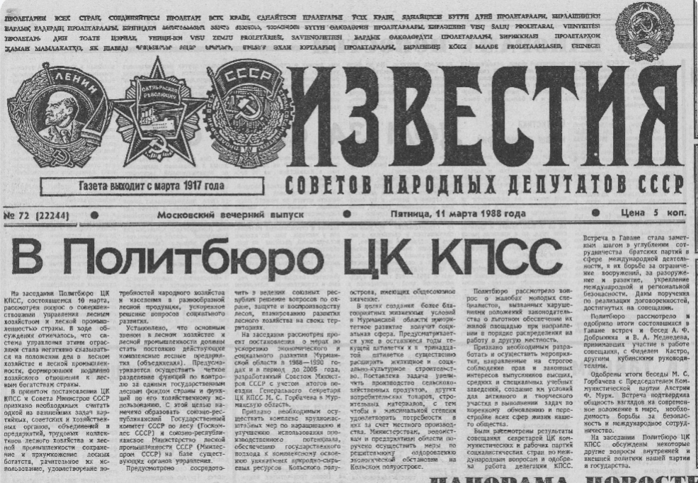 О постановлении политбюро ЦК КПСС, источник: газета «Известия» 11 марта 1988 1 стр. 4