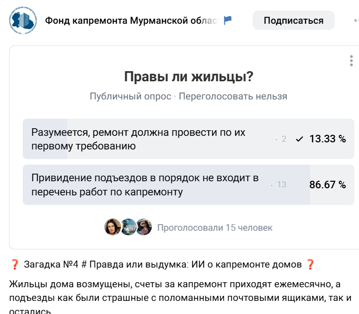 В паблике Фонда капитального ремонта Мурманской области появился интерактив с жильцами. В противовес жалобам в комментариях в соцсети на устаревший жилфонд, отсутствие ремонта в домах, недостатки кампании по замене лифтов в многоквартирных домах администраторы паблика организовали викторину по коммунальным нормам.