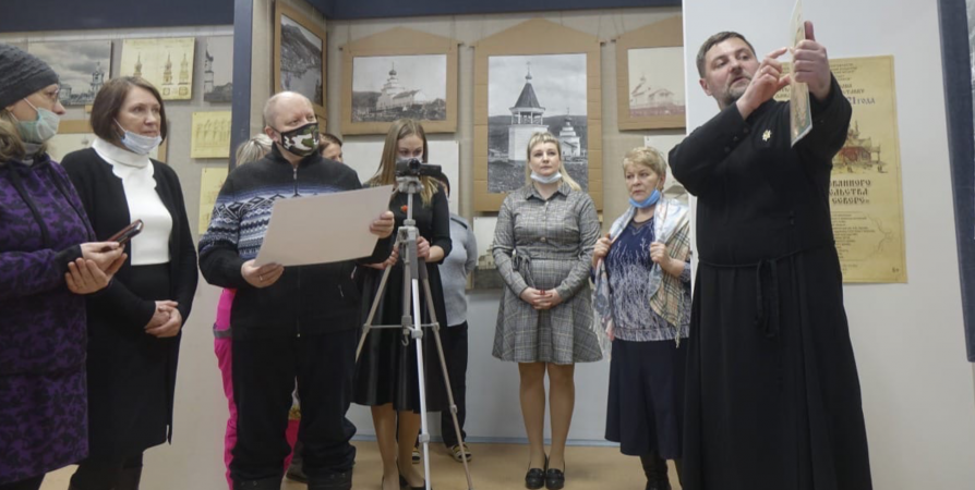 Создатель выставки - руководитель Отдела культуры Мурманской епархии Тимофей Пискунов, который провел экскурсию для первых посетителей выставочного зала.