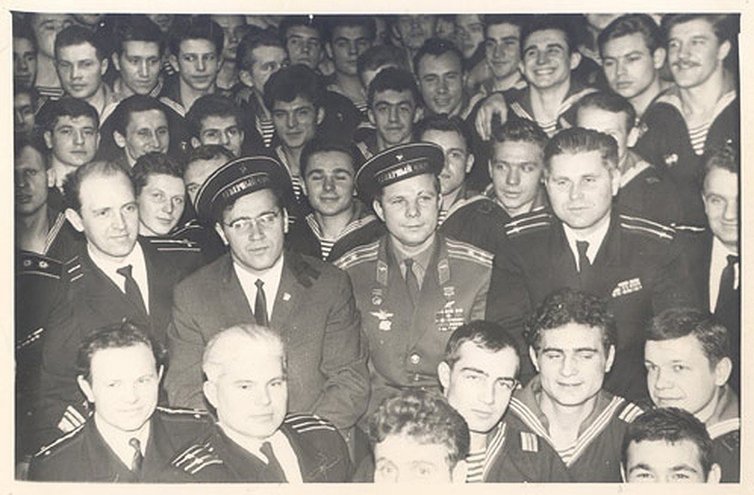 Ю. А. Гагарин, Б. Н. Пастухов (слева), Э. Г. Бульон (справа) с моряками — североморцами. г. Североморск. 1965 г., источник: ФГБУК «Музей-заповедник Ю. А. Гагарина»